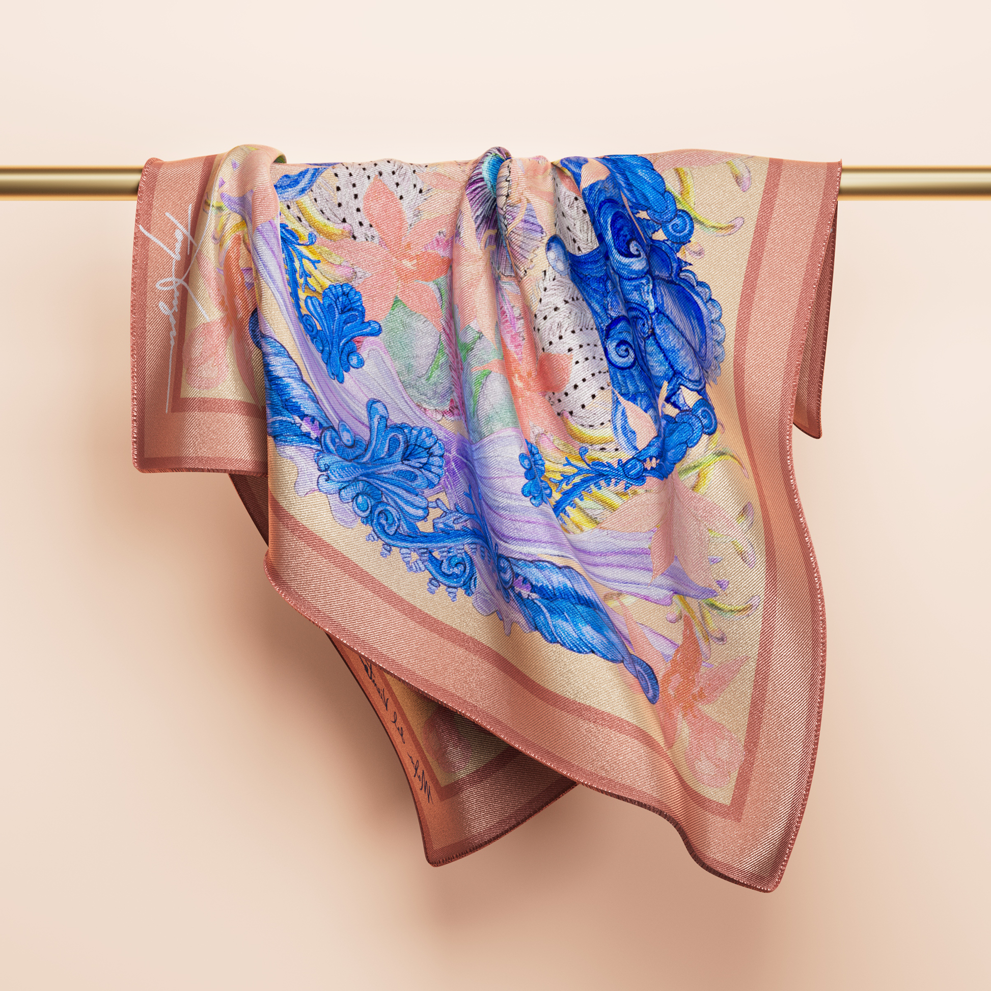 “Flor de Aire” es un pañuelo que celebra la ligereza, la pureza y la gracia de lo invisible. Cada pétalo está pintado en seda con la delicadeza de lo efímero: tonos suaves que cambian con la luz, como si respiraran.